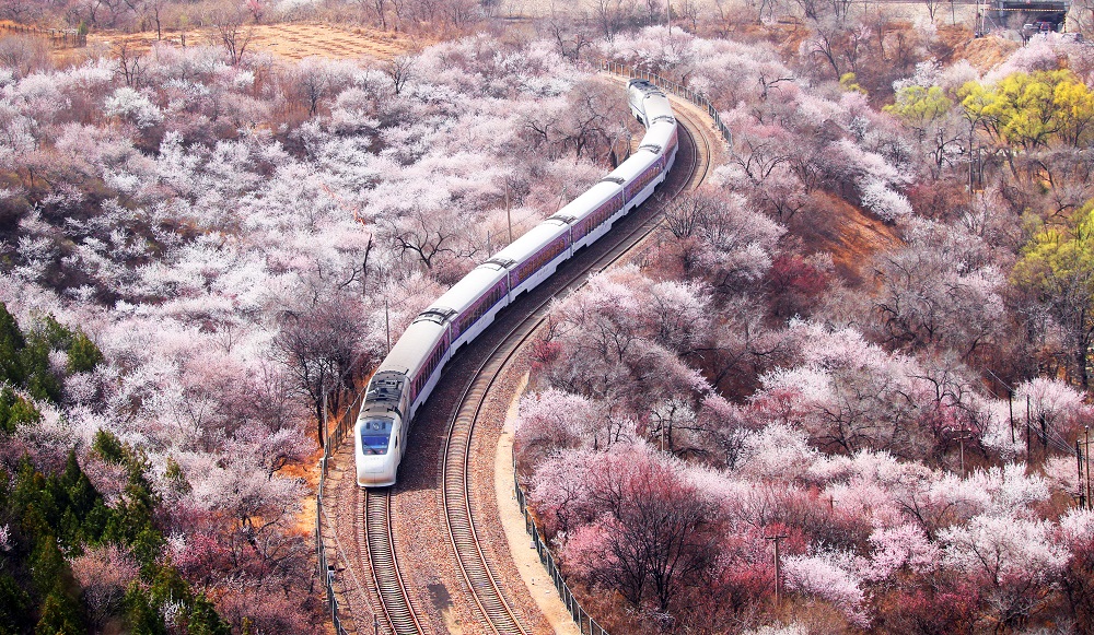 Beneath the Juyongguan Great Wall in Beijing, flowers bloomed in abundance, painting a vibrant scene of spring. The S2 railway line winds through this floral sea, earning its nickname as the "train to spring".