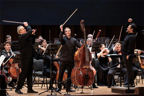 Violinist Vadim Repin (left) and contrabassist Artem Chirkov and Lin Daye performing. [Photo provided to chinadaily.com.cn]