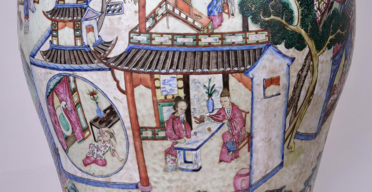 Famille rose porcelain vase with depictions of key moments from "The Legend of the White Snake"
