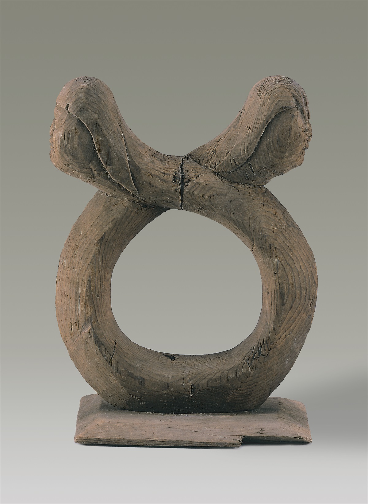 The wooden sculpture depicting two human heads sharing a snake body, Yang Wu Kingdom of the Five Dynasties and Ten Kingdoms (907-960), from the collection of Yangzhou Museum [Photo/Official website of Yangzhou Museum]