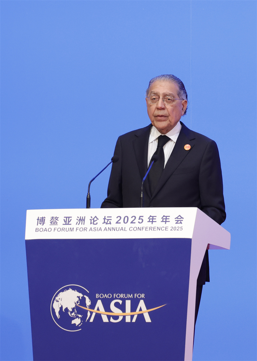 Munir Akram, permanent representative of Pakistan to the United Nations, speaks at a high-level dialogue themed on "Global Governance after the UN Summit of the Future" during the Boao Forum for Asia (BFA) Annual Conference 2025 in Boao, South China's Hainan province, March 26, 2025. [Photo/Xinhua]