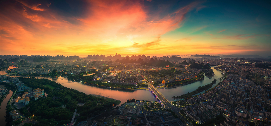 The photo depicts a dramatic cluster of fiery clouds enveloping the city of Guilin in Guangxi Zhuang autonomous region. [Photo by Huang Yijun/For chinadaily.com.cn]