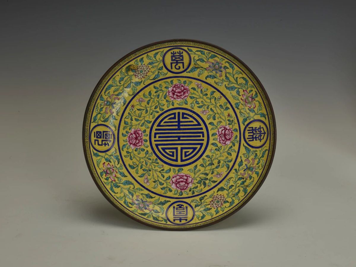Painted enamel bronze plate with motifs of Chinese character 寿