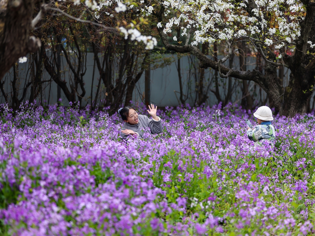 At the Liushuwan scenic area of the Ancient Yellow River Ecological Folk Park in Huai’an, Jiangsu province, visitors enjoy strolling among pear blossoms, rapeseed flowers and poppies.
