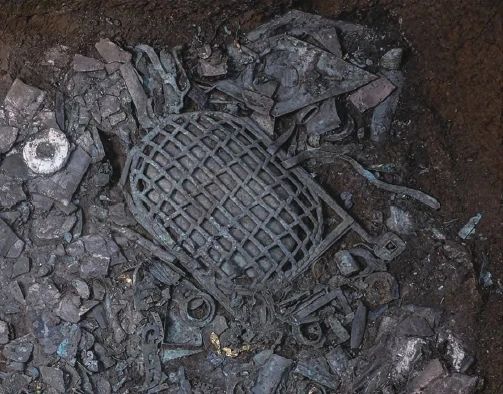 Close-up of the bronze item with a grid shape resembling a turtle's back discovered in pit No 7 [Photo/Sanxingdui Museum official WeChat account]