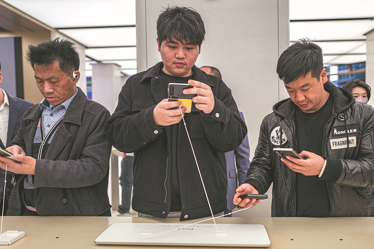 Consumers experience the Huawei Pura X, a foldable phone that can be used both horizontally and vertically, at a Huawei mobile store in Shanghai on March 20. CHINA DAILY