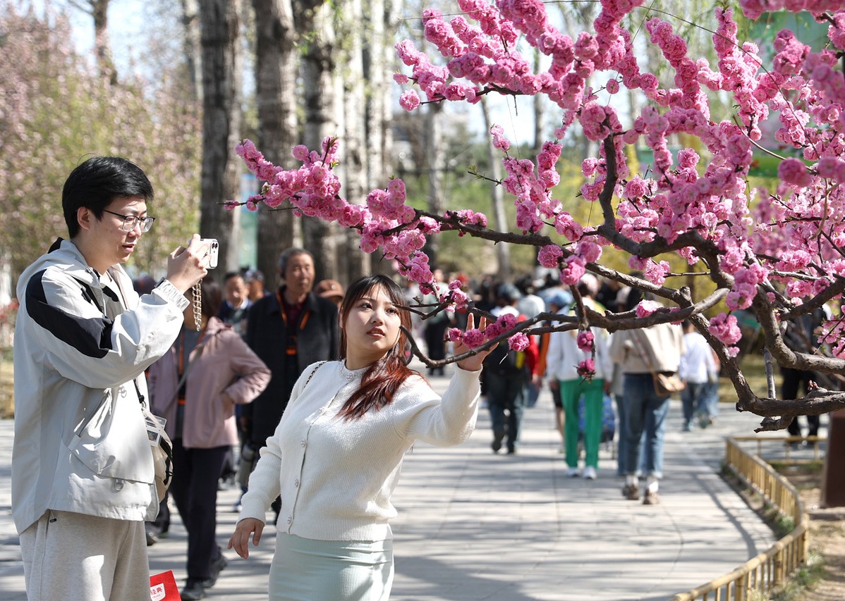 Tourists appreciate flowers and pose for photos at Yuanmingyuan Park in Beijing, April 2, 2025. [Photo by Zou Hong/chinadaily.com.cn]