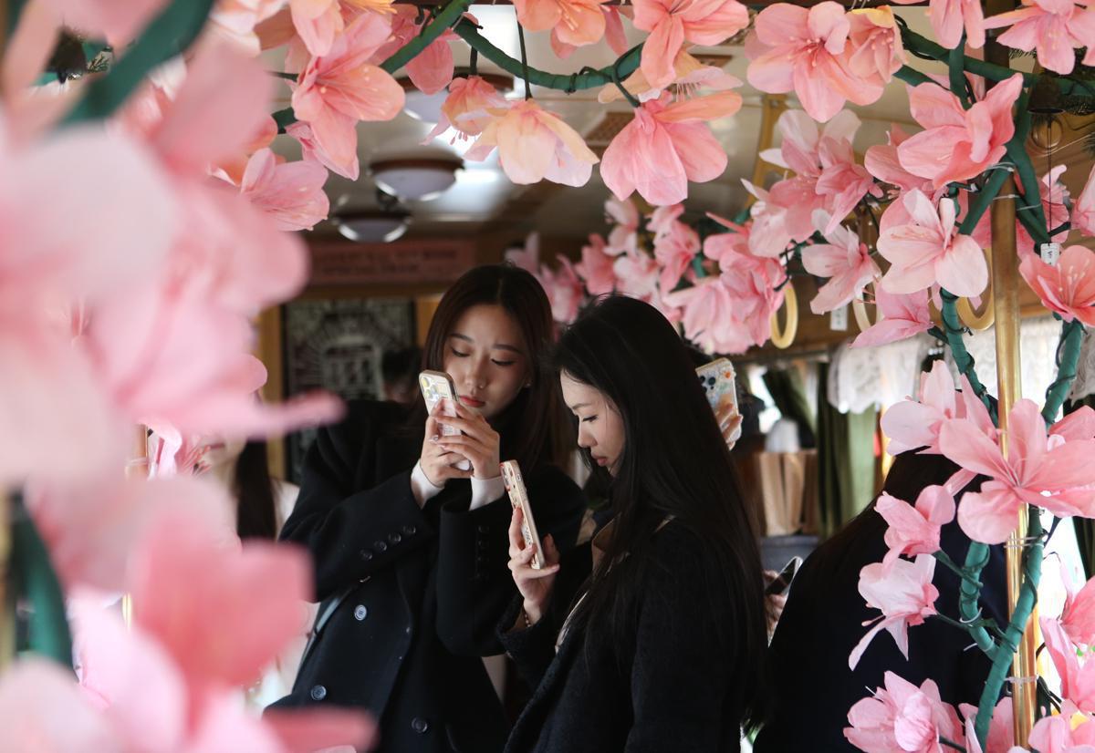 The No 54 spring-themed tramcar in Changchun, Jilin province, attracts passengers to take photos. [Photo by Jilin Daily/For chinadaily.com.cn]