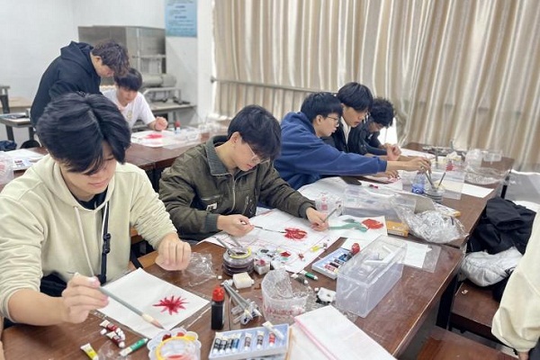 Singaporean students participate in a painting activity at Nantong Vocational University. [Photo/chinadaily.com.cn]