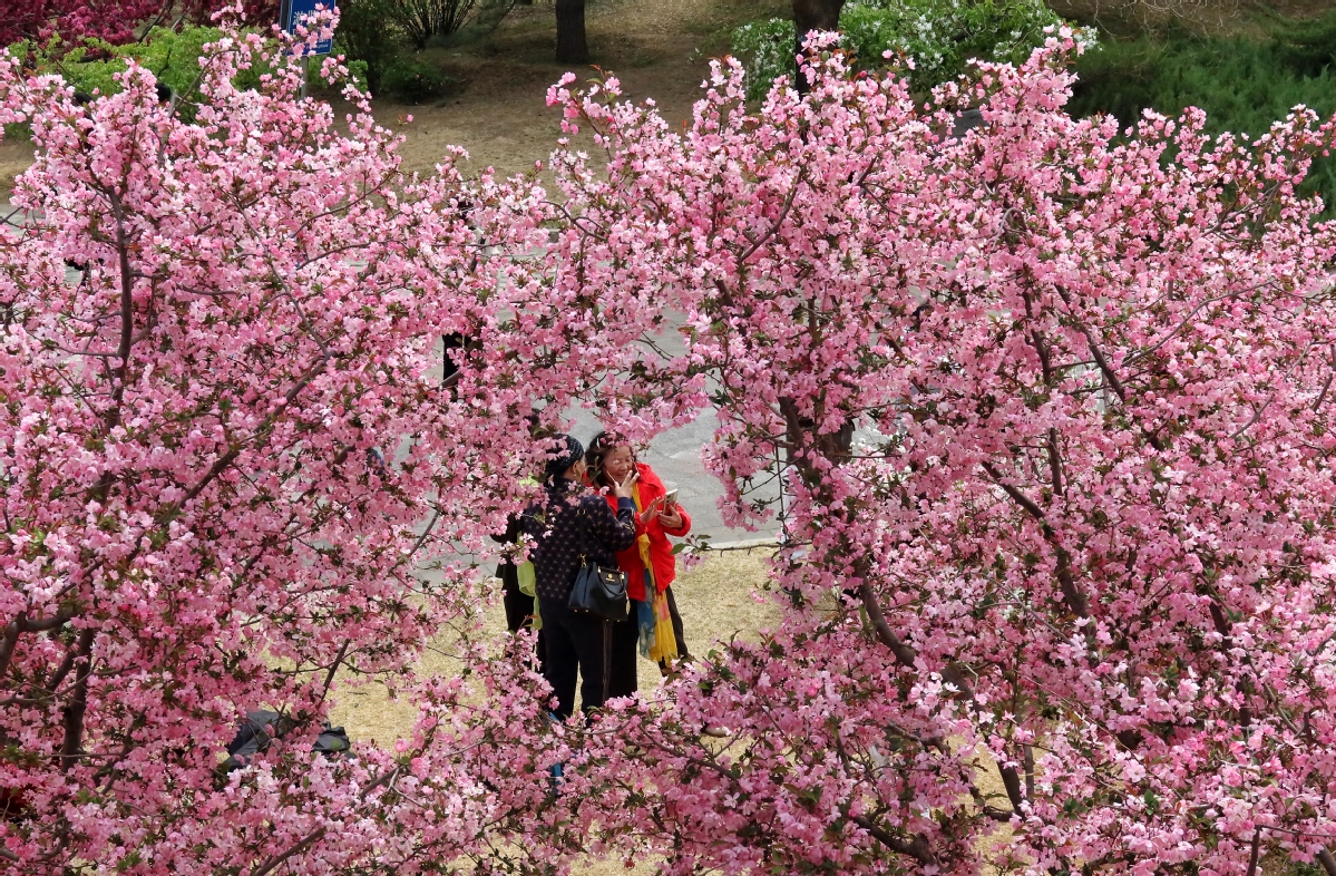 People enjoy breathtaking flowers at the China National Botanical Garden in Beijing, on April 9, 2025. Recently, over 1,000 crabapple trees have burst into full bloom at the China National Botanical Garden, attracting crowds of visitors to admire the floral display. [Photo by Jiang Dong/chinadaily.com.cn]