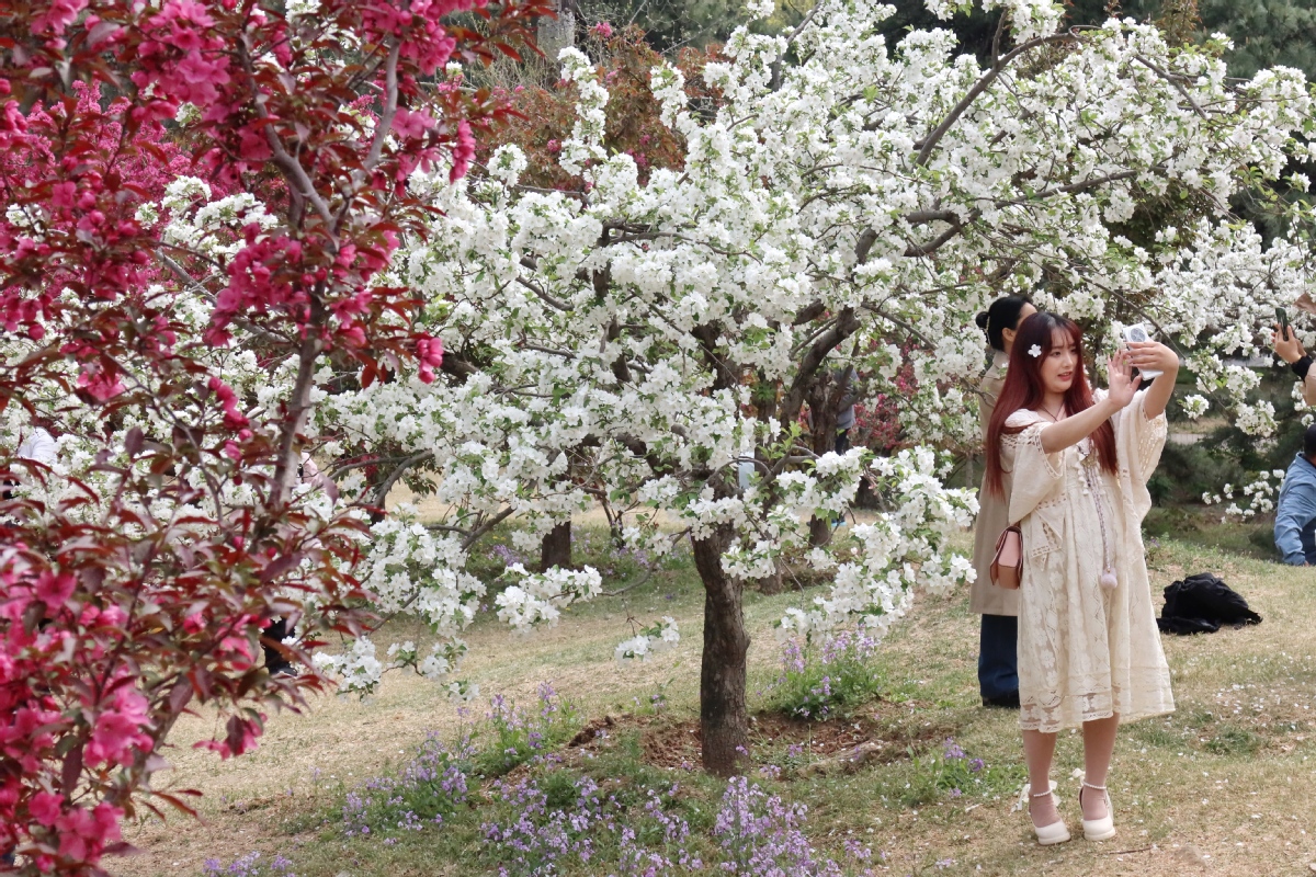 People enjoy breathtaking flowers at the China National Botanical Garden in Beijing, on April 9, 2025. Recently, over 1,000 crabapple trees have burst into full bloom at the China National Botanical Garden, attracting crowds of visitors to admire the floral display. [Photo by Jiang Dong/chinadaily.com.cn]