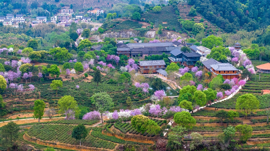 In Liubao town, Cangwu county, Wuzhou, Guangxi Zhuang autonomous region, the vibrant purple bauhinia flowers in full bloom perfectly complement the lush green tea gardens. What a stunning scene!
