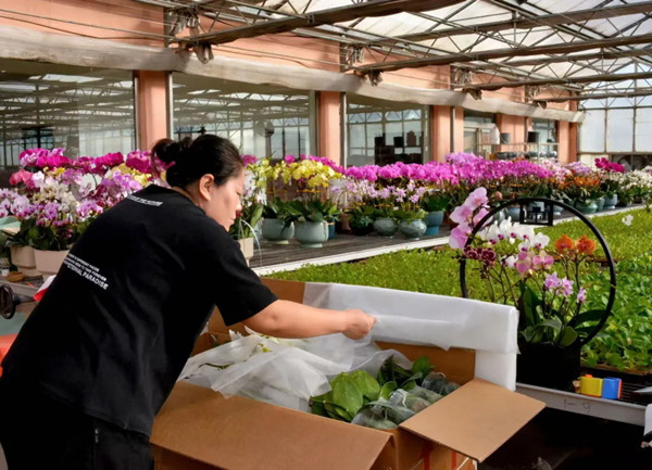 In Yangjiayao village, a 16,000-square-meter phalaenopsis orchid cultivation base employs smart greenhouse technology to grow high-quality orchids. A total of 300,000 of these orchids are sold per year, priced between 40 ($5.44) to 100 yuan each and generating over 10 million yuan in revenue.