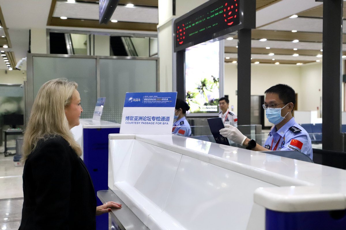 Frontier inspection officers at Haikou General Station serve international travelers upon arrival. [Photo provided to chinadaily.com.cn]
