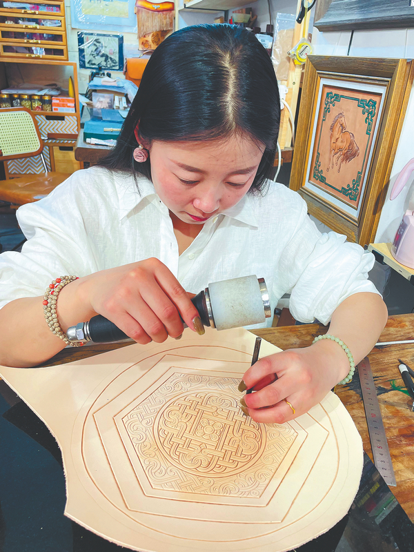 Li Xiaofang (center) works on leather carving in Hohhot, Inner Mongolia autonomous region.CHINA DAILY