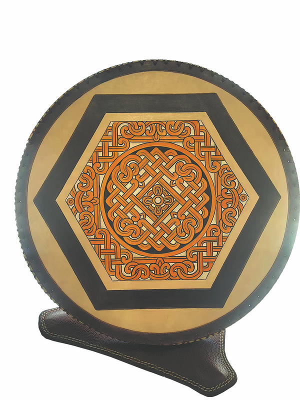 A leather-carved painting combining traditional ethnic Mongolian totems with Suzhou-style window lattice designs. CHINA DAILY