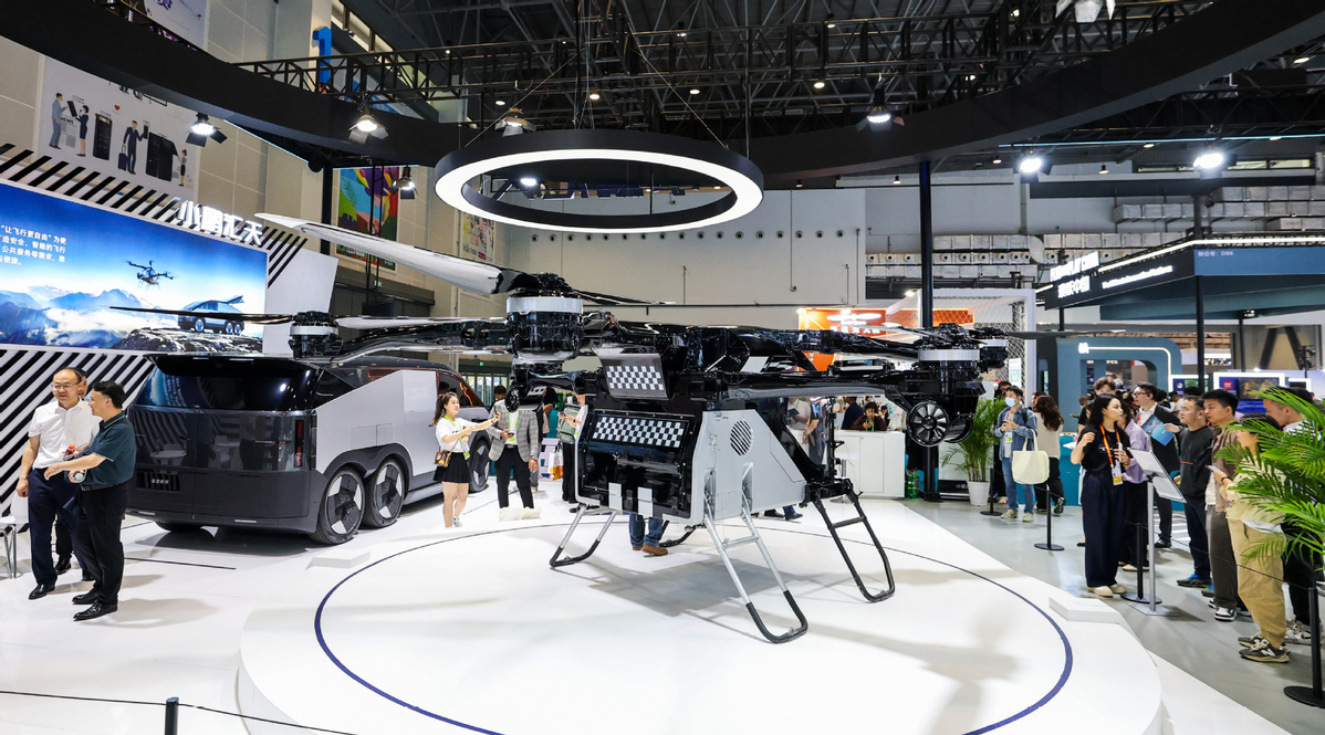 Visitors look at a flying car by Xpeng AeroHT at the 5th China International Consumer Products Expo (CICPE) in Haikou, South China's Hainan province, April 13, 2025. [Photo/Xinhua]