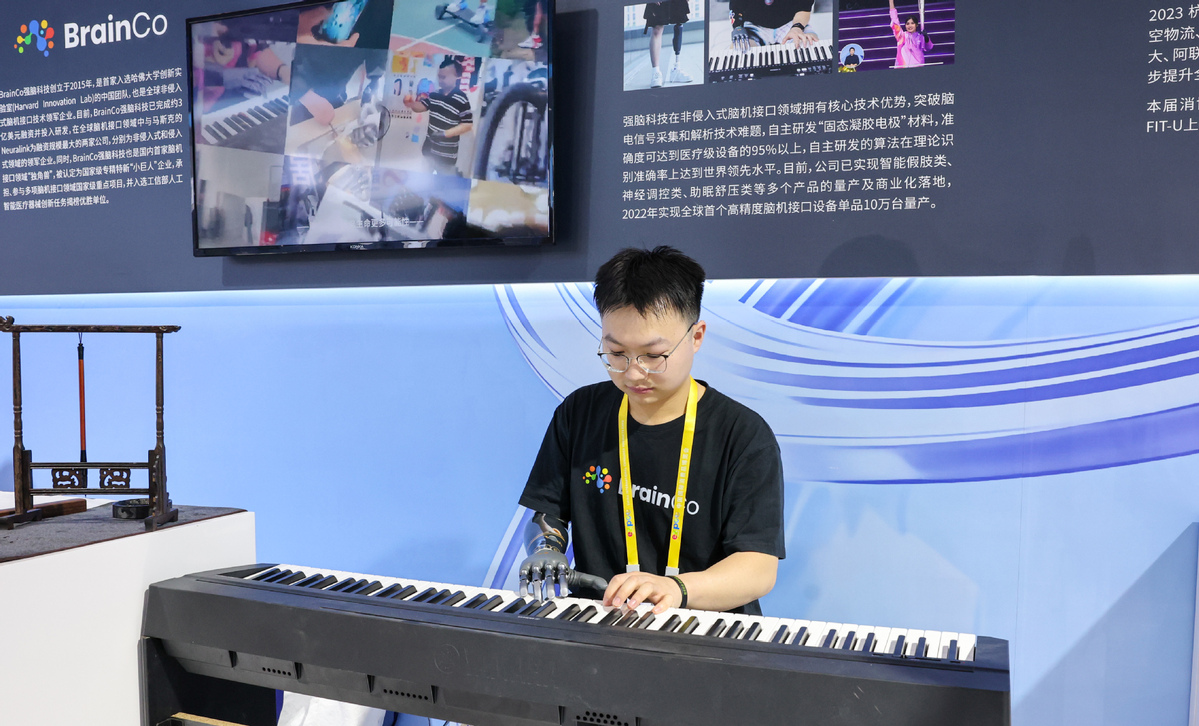 An exhibitor plays piano with a smart prosthetic hand at the 5th China International Consumer Products Expo (CICPE) in Haikou, South China's Hainan province, April 13, 2025. [Photo/Xinhua]