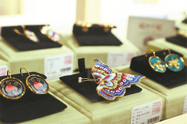 Earrings and brooches featuring Beijing embroidery motifs.[Photo provided to China Daily]