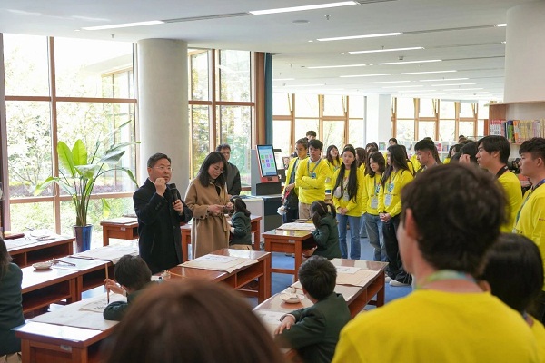 US students attend a Chinese calligraphy activity in the library of the Primary School Affiliated to Jinling High School. [Photo/WeChat account: jsjyws_jeaie]