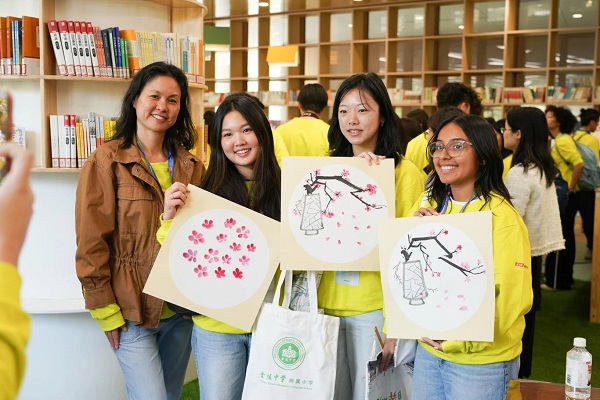 US students hold plum blossom paintings they made. [Photo/WeChat account: jsjyws_jeaie]