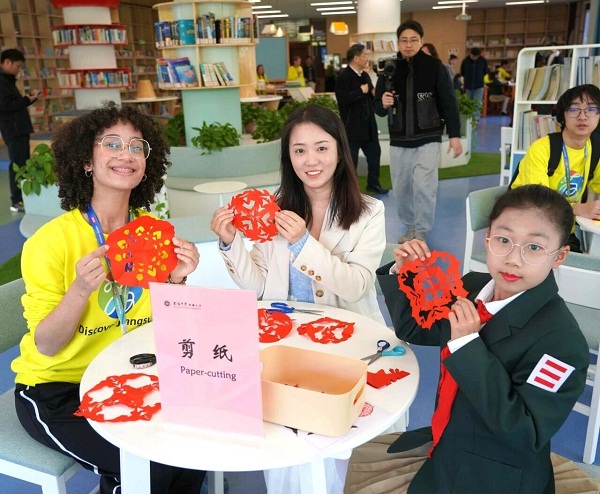 Inside the school library, young cultural ambassadors from the host school guided their US guests through hands-on experiences in four signature Chinese traditions: calligraphy, ink painting, paper-cutting, and Chinese chess.