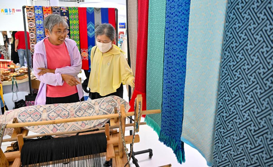 People select products of Xilankapu brocade, a national intangible cultural heritage, at the 5th China International Consumer Products Expo (CICPE) in Haikou, South China's Hainan province, April 15. [Photo/Xinhua]