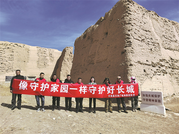 Staff holding a banner that says "Protect the Great Wall as diligently as you would protect your home" take a group photo in front of a surviving section of the architectural wonder.[Photo provided to China Daily]