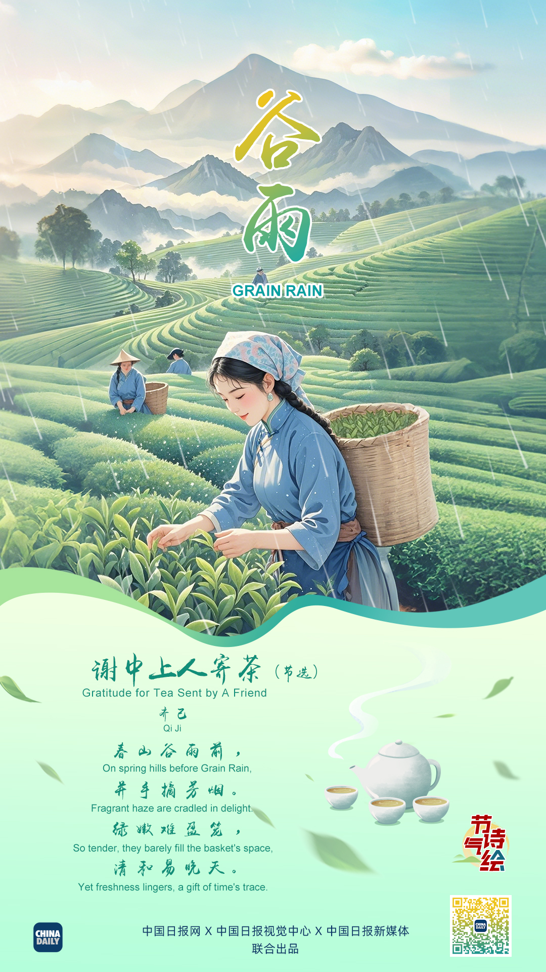 Grain Rain marks the end of spring. Bathed in spring showers, the earth rejuvenates and tea hills glisten. As put by Tang Dynasty (618-907) poet Qi Ji, tender and fragrant tea picked before Grain Rain is a gift from above. Let's savor this cup of fresh brew and look forward to summer's radiant hue.