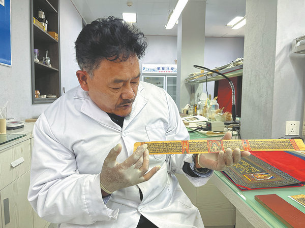 Tsering Wangdu, a restoration specialist, examines a palm-leaf scripture at the Protection Research Center of the Palm-Leaf-Scriptures of Potala Palace. [Photo by Palden Nyima/China Daily]