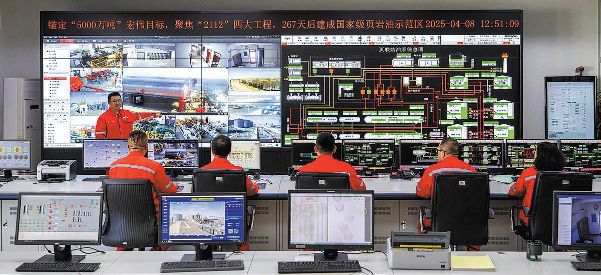 Workers monitor production at a shale oil station in the oilfield on April 8. LYU DIANJIE/YANG CHUYI/FOR CHINA DAILY