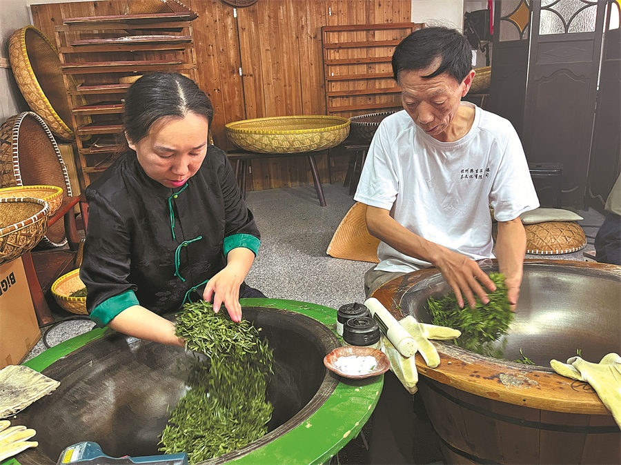 About 1 pm on an early April Friday, at a studio in Tongwu village, one of the planting regions of Longjing (Dragon Well) tea in Hangzhou, East China's Zhejiang province, nine men and a woman were sitting before a shiny steel wok, each with one of their bare hands rhythmically stirring fresh tea leaves that were picked earlier that morning.