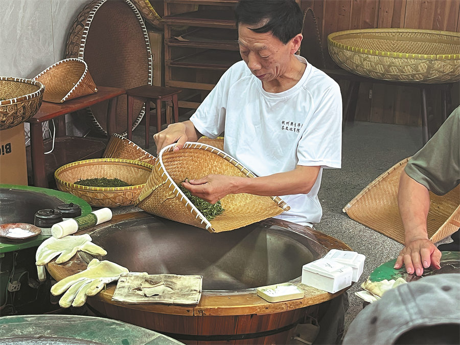 The roasting of standard Longjing tea involves nine meticulous steps, including spreading, primary wok-frying, shaping, rehydrating, final wok-frying, sifting and so on. Particularly during the wokfrying process, ancestral tea masters had developed a distinctive technical sequence known as the "10 essential hand movements" of West Lake Longjing tea processing, such as grasping, shaking, pushing, smoothening, pressing and so on.