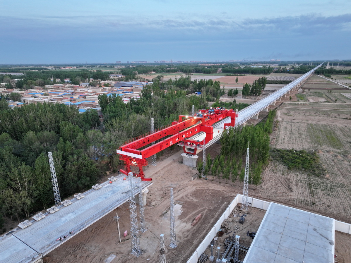 Girder erection work in the Hebei section of Xiong'an-Shangqiu high-speed railway was fully completed on Sunday as the last box girder was erected on a mega bridge. The 552-kilometer-long railway will connect Xiong'an in North China's Hebei province and Shangqiu in Central China's Henan province with a designed speed of 350 kilometers per hour.