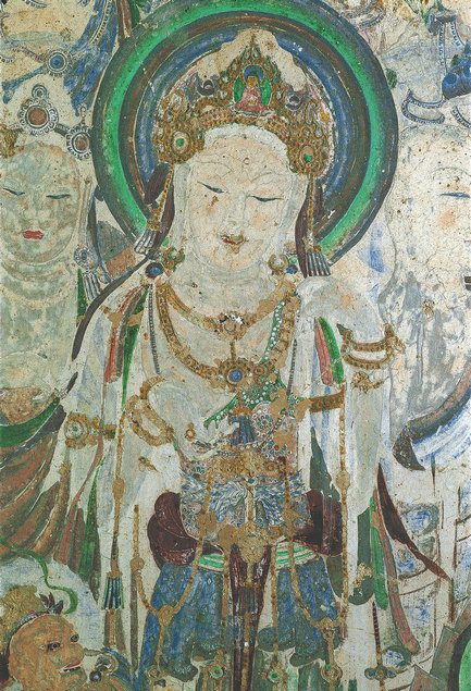 One figure who has received more than a few touches of gold is the Bodhisattva depicted in Cave 57 of the grottoes. Lavishly accessorized with gold bracelets and necklaces, as well as a gilded headdress the rich luster of which dances against the luminosity of her faint vermilion-colored skin, the Bodhisattva embodies the ideal of female beauty during the Tang Dynasty.