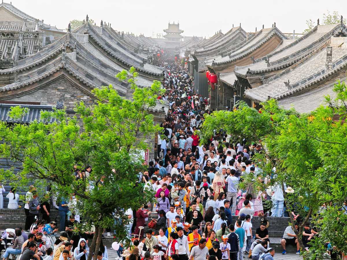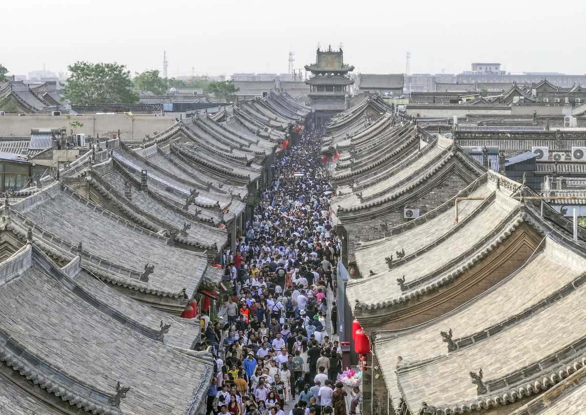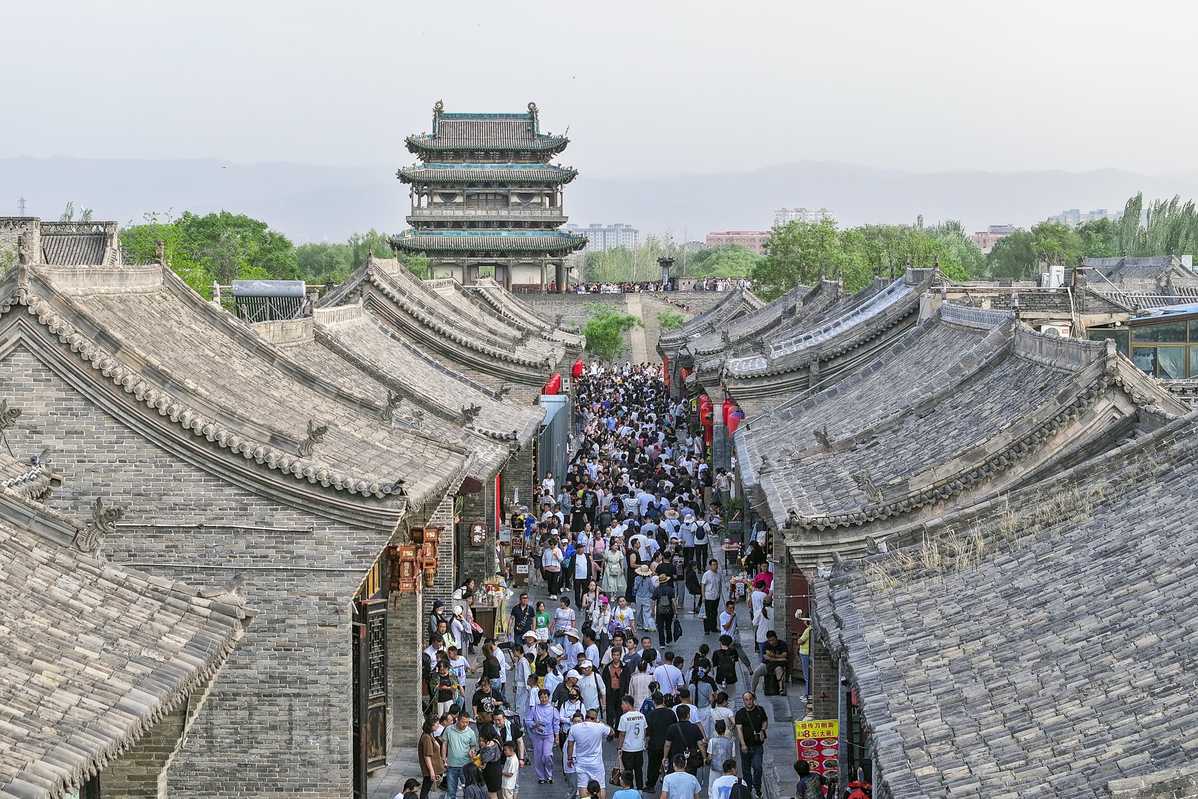 Tourists enjoy their holiday at Pingyao Ancient City in Jinzhong, North China's Shanxi province, on May 2, 2025. The tourist flow is at its peak, as the alleys and scenic spots in the ancient city are crowded with visitors. According to statistics from the local culture and tourism department, over 70,000 visitors were received here on May 2, 2025. [Photo by Liang Shengren/For chinadaily.com.cn]