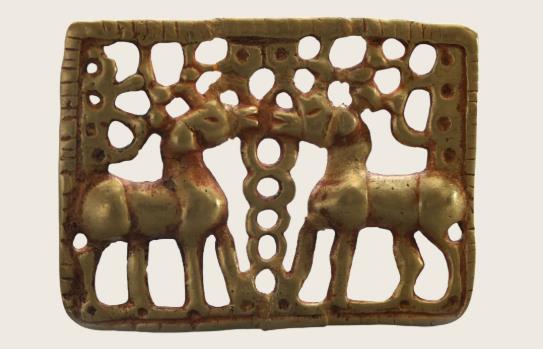 Gold plaque with two deer motifs, Eastern Han Dynasty (25-220), from the collection of Ulanqab Museum [Photo/Tianjin Museum official WeChat account]