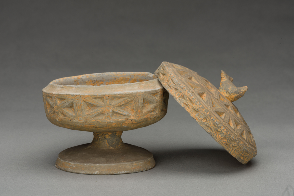 Pottery incense burner with geometric motifs and a bird-shaped knob on the lid, Western Han Dynasty [Photo/Changsha Jiandu Museum official WeChat account]