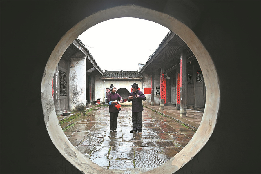 Wu Dengxian (right) rehearses with Yang Ranlin at the Sanwang Palace Theater in Sanjiang Dong autonomous county, Liuzhou, Guangxi Zhuang autonomous region.[Photo provided by