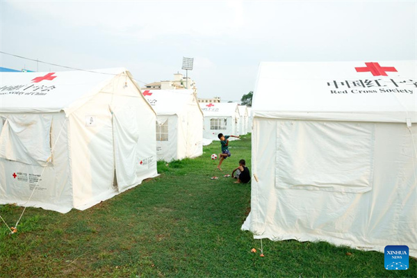 Children play soccer outside their tents donated by China in Mandalay, Myanmar, May 10, 2025. [Photo/Xinhua]