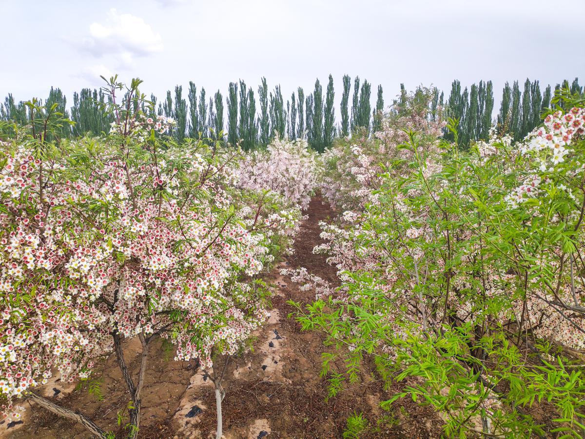 The shiny-leaved yellowhorn trees at an institute in Zhangye, Gansu province, recently entered their peak flowering period, adding a touch of elegance to the early summer desert.