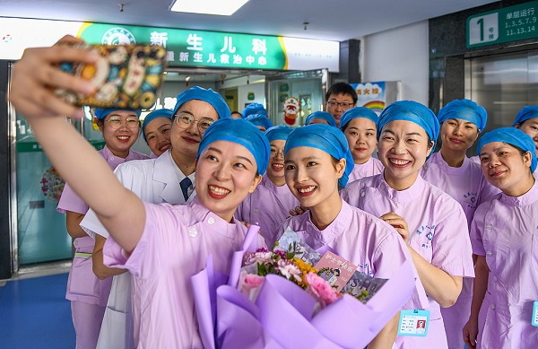 Nurses taking a selfie in a hospital in Yongzhou, Hunan province, May 12, 2025. [Photo/VCG]