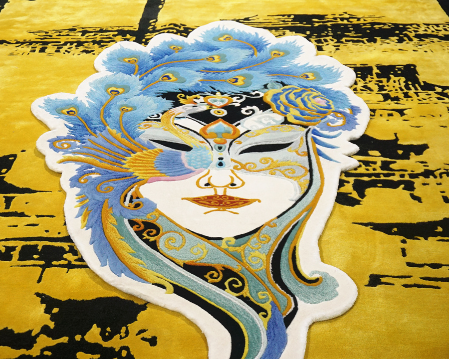 A detailed carpet featuring a traditional opera mask on display at the Yangxin Carpet Museum. [Photo by Bi Nan/chinadaily.com.cn]