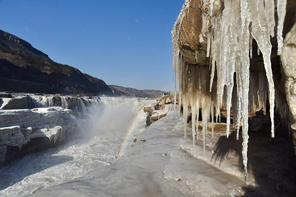 The Hukou Waterfall, with enchanting all-season scenery, is known for its eight great views, namely the "Smoke from the Deep Waters", "Boats Sailing on the Dryland", "Rainbow above the Water", "Exploded Mountain Rocks and Poured Water", "Rain against the Sunny Sky", "Thunder in the Dry Season", "Upside-Down Ice Peaks" and "Tunnel of Running Dragon. Its marvelous landscapes are widely praised and considered a great symbol of the courageous and upright Chinese ethnic spirit.