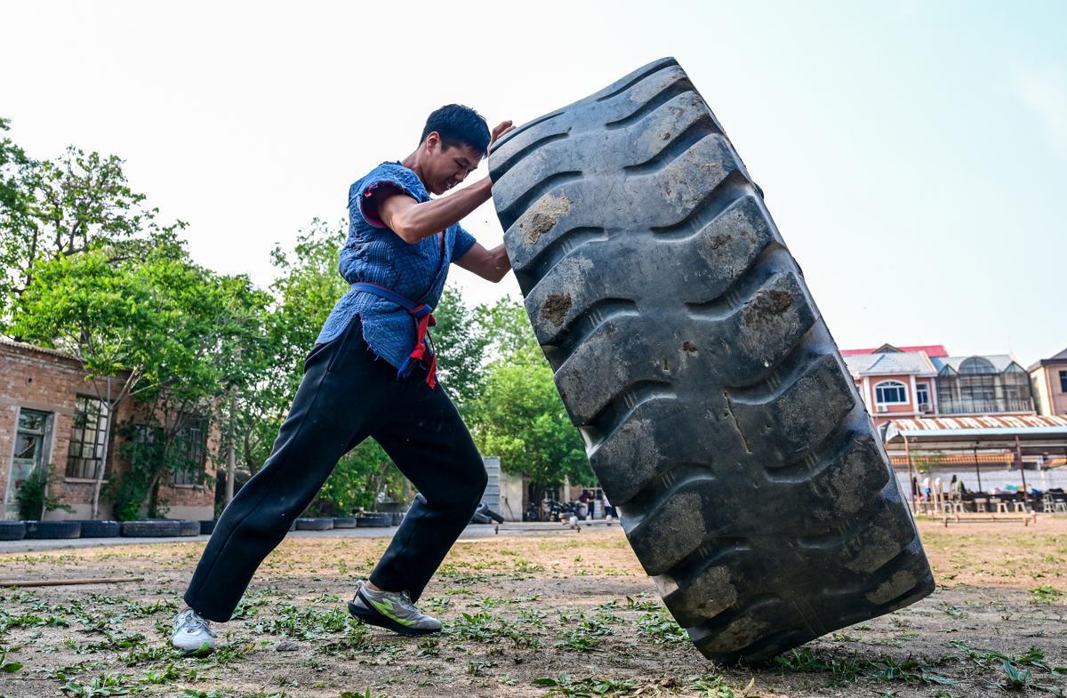 Lacking funds, Bai uses homemade equipment, such as old tires, for training.
