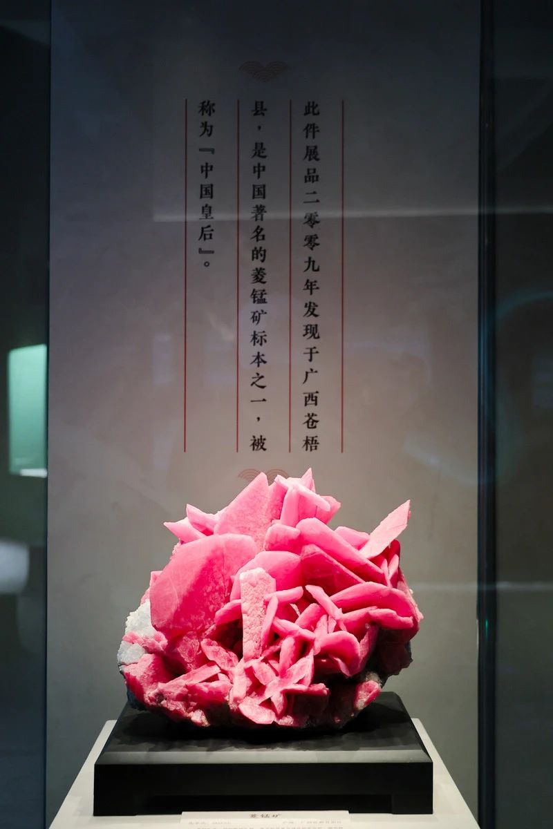 Rhodochrosite specimen discovered in Guangxi on display at the National Museum of China [Photo/National Museum of China official WeChat account]