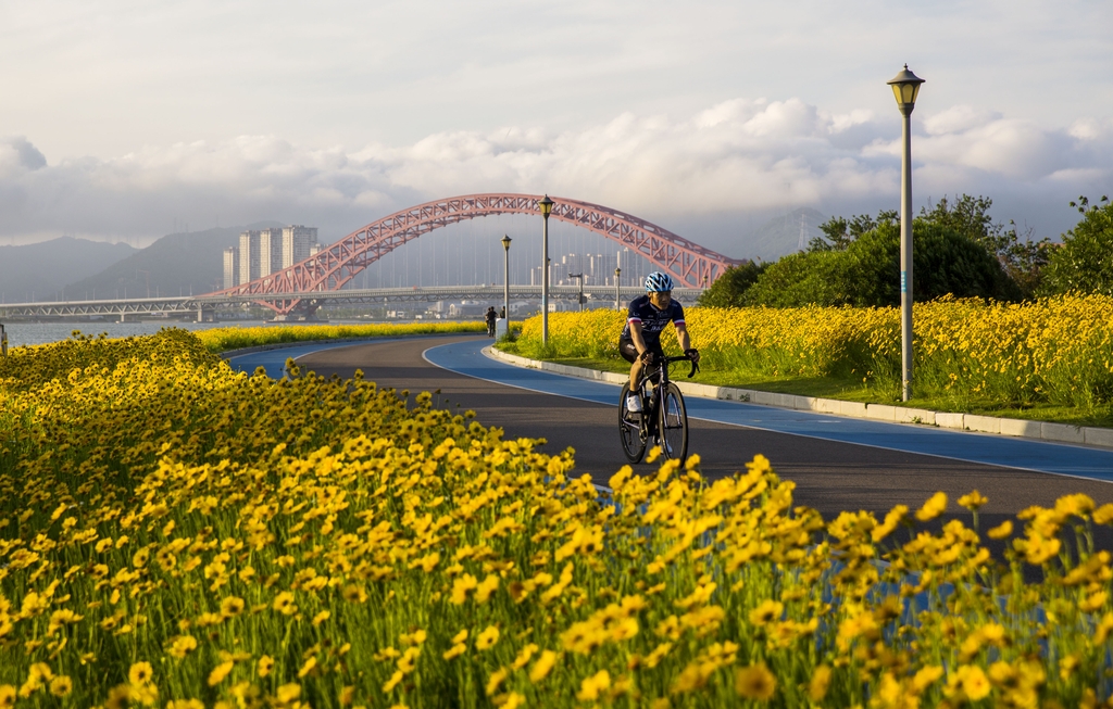 On May 14, residents were seen strolling along the greenway of the Meishan Bay Slow-Traffic System in Beilun district, Ningbo city, Zhejiang province, admiring the blooming Nippon daisies. This vibrant sea of flowers, set against the backdrop of the blue sea and sky, creates a stunning aquatic ecological landscape.