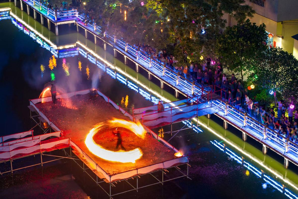 This May 1, 2025, photo shows a folk art performance that features a fire circle in Duanzhou district, Zhaoqing city, South China's Guangdong province. [Photo/Xinhua]