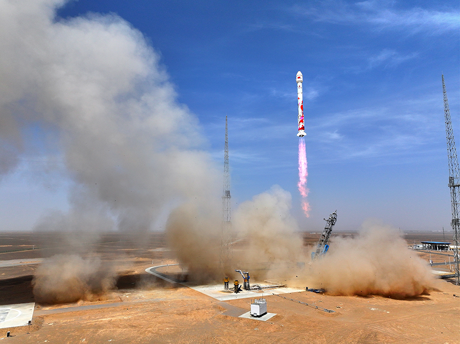 A commercial rocket coded ZQ-2E Y2 blasts off from the Dongfeng commercial space innovation pilot zone near the Jiuquan Satellite Launch Center in Northwest China, May 17, 2025. [Photo by Wang Jiangbo/For chinadaily.com.cn]