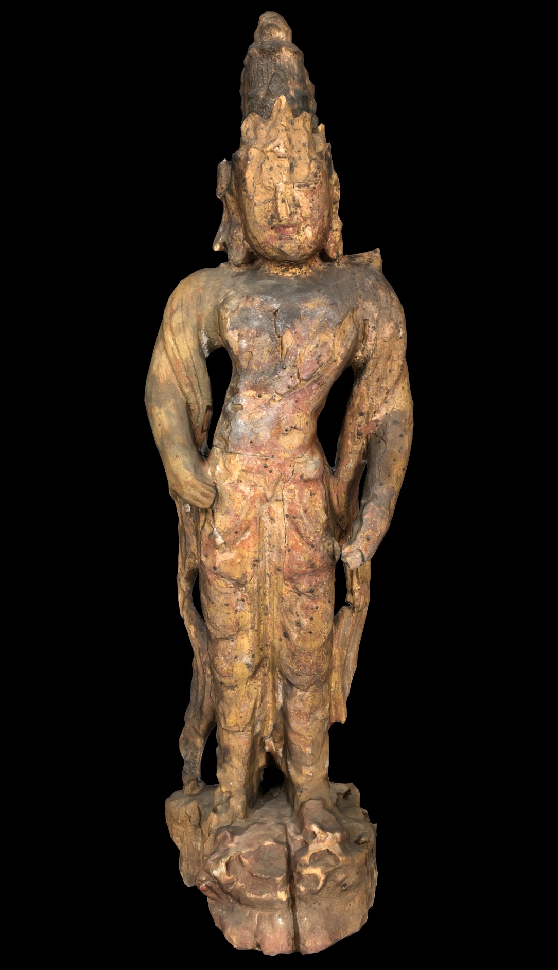 Wearing a high crown, adorned in jewelry and a long skirt, and with a chubby, delicate face and slender brows, this statue of Avalokitesvara (Guanyin) from the Western Xia Dynasty (1038-1227) was carved from a single block of wood. Standing on a waisted pedestal, the statue once gleamed in red paint and gold leaf, most of which has faded with time. Despite the missing right hand, the bodhisattva is still stunning with an elegant pose.